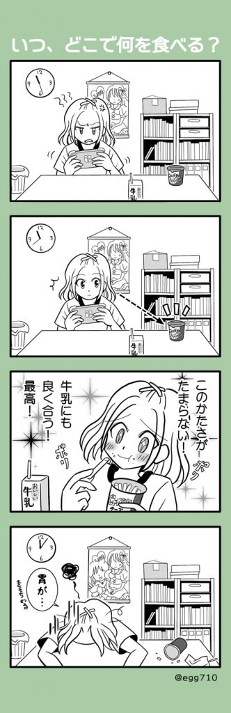 本来おやつは幸せなもの。反省ですね。じゃがりこはチーズ味が好き。牛乳は元気が出る食べ物。